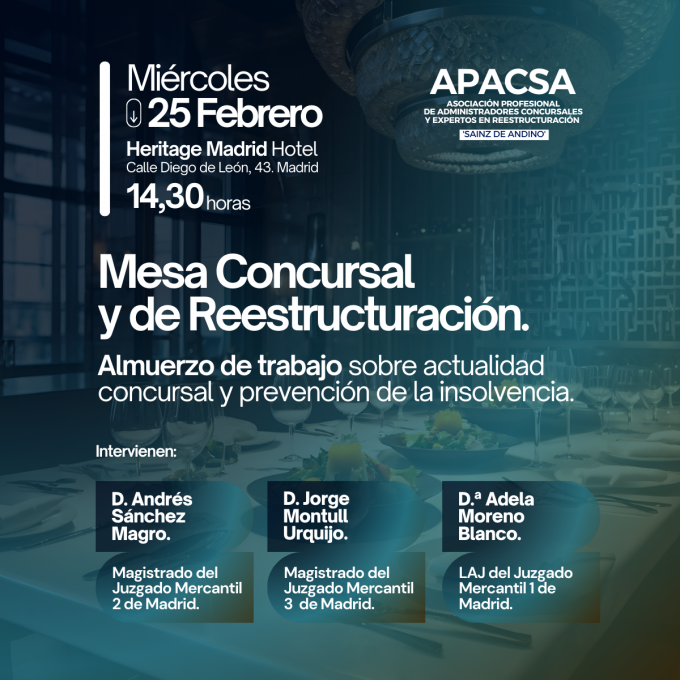 La Asociación Profesional de Administradores Concursales y Expertos en Reestructuración ‘Sainz de Andino’ (APACSA) pondrá en marcha en Madrid un nuevo ciclo de almuerzos de trabajo centrado en la actualidad concursal y de reestructuración. El objetivo de esta nueva iniciativa es fomentar el análisis práctico y el intercambio de criterios entre profesionales del sector. La…